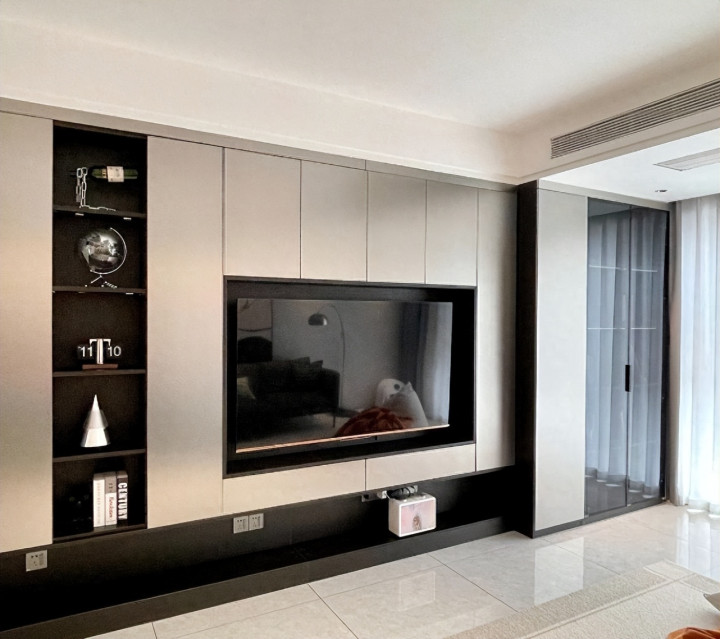 如果你家收纳需求大,可以考虑在电视墙做几格隐藏柜,但一定不要做太突出、太抢眼的造型,否则很容易显得累赘。