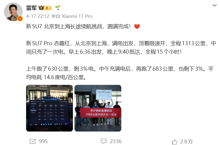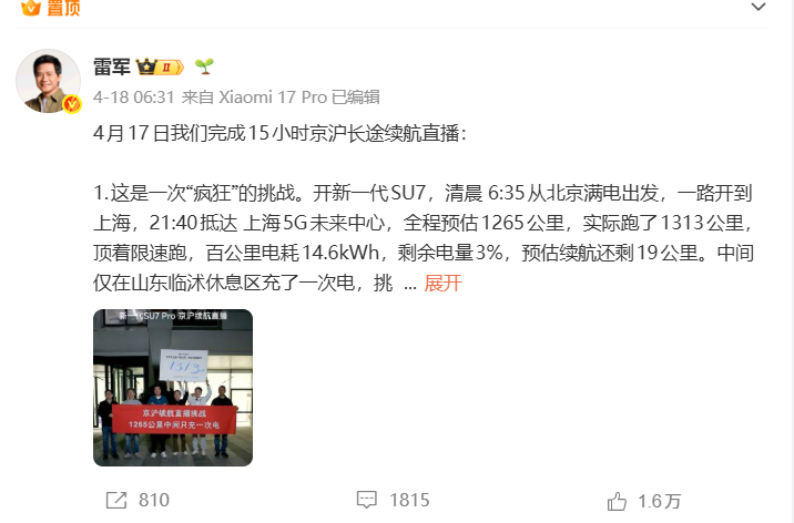 4月17日,小米创办人、董事长兼CEO雷军开启全程15小时直播,测试小米SU7 Pro从北京到上海的长途续航,满电出发中间只充一次电。