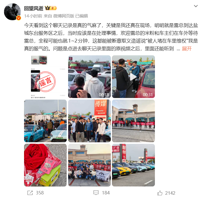 微博数码博主“回望风逝”19日发文,雷军当时到达盐城东台服务区之后,应该是在处理事情,欢迎雷军的米粉、车主在车外等待,全程可能就 1-2 分钟。但最终还是被人断章取义造谣说“被人堵在车里维权”。